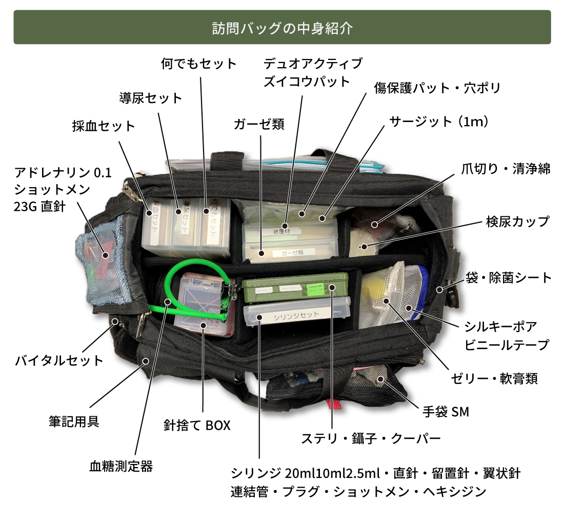 針セット、シリンジセット、導尿セット、採血セットと分けたケース、採血で使用した針を破棄するボックス(ハリクイ)、印鑑などが入っています。バッグの中は、大小様々なケースを使用し、分かりやすく取り出しやすい工夫をしています。