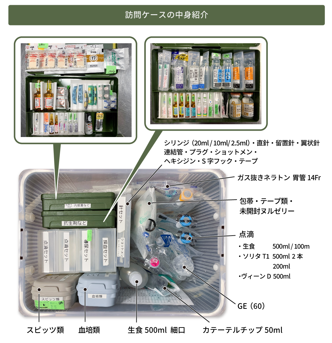 診療は、定期的な体調管理の他に、傷の処置や点滴など日々あらゆる状況がありますが、その場である程度の状況に対応にできるよう多くのものを持参しています。